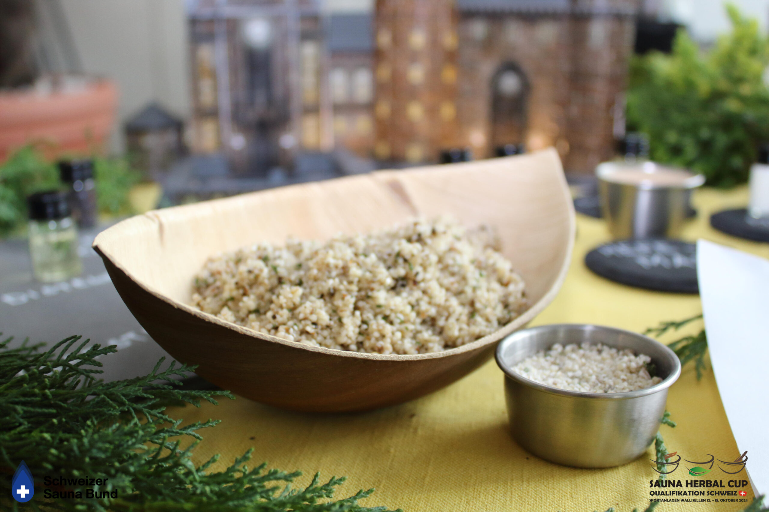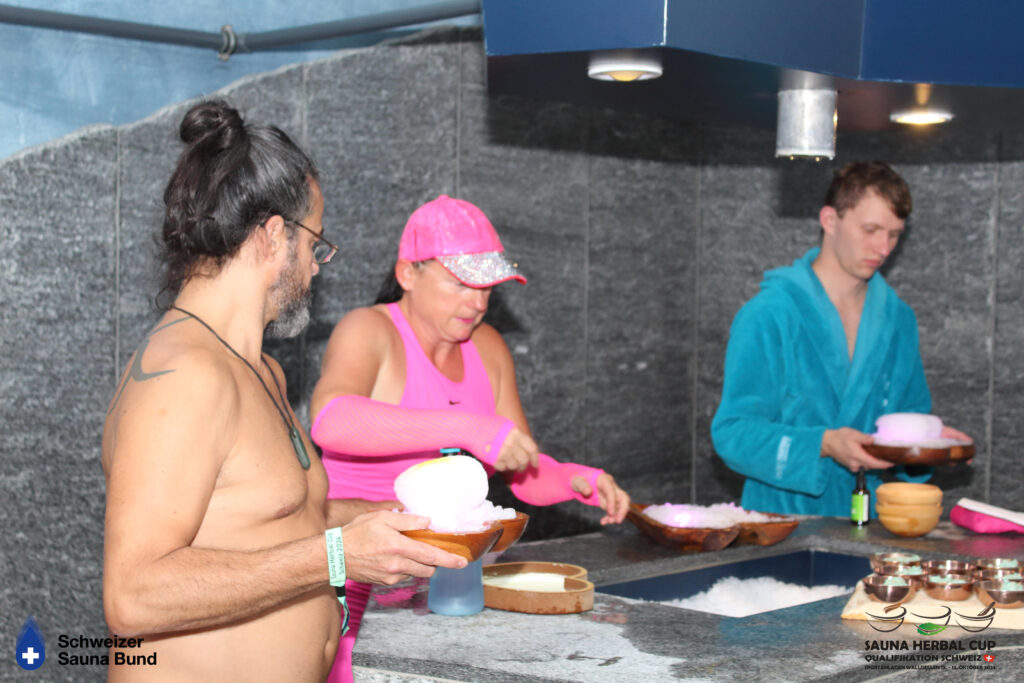 Die zweite Disziplin findet im Dampfbad statt und legt den Schwerpunkt auf hautpflegende Anwendungen. Die Teilnehmenden präsentieren ein selbst entwickeltes Peeling-Ritual auf Basis natürlicher Inhaltsstoffe. Auch hier gilt: Die Anwendung soll angenehm, nachvollziehbar und wirksam sein – nicht experimentell oder überladen.